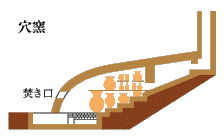 | 穴窯 縄文式土器や弥生式土器は、野焼きという方法で焼かれていました。 地面を浅く掘り、小枝や薪を燃やし、その中で土器を焼くという方法です。しかしこのような野焼きでは、熱が逃げてしまい、温度も700度程度までしか上がりません。そこで熱が大気中を上昇するという性質を利用して、山の傾斜面に勾配を付けた穴を掘り、低い方から燃料を燃やし、蓋をして燃焼時の熱が逃げないような方法を考え出しました。これが穴窯の始まりだと考えられています。 窯としては歴史的にもっとも古く、原始的な構造を備えています。現代の様々な窯の祖型であり、火と土との戦いによって、力強く素朴な、神秘的なまでに美しい作品を現代まで時を超えて生み出している。 穴窯は合理性に欠け、経済性を無視する窯であり、だからこそ科学的な合理性と経済性が支配する現代社会の中で、穴窯の存在する意義が見直されていると考えられる。 |