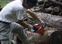 | [薪作り] 丸太をチェンソーで約40cmの長さに玉切りしていきます。 |